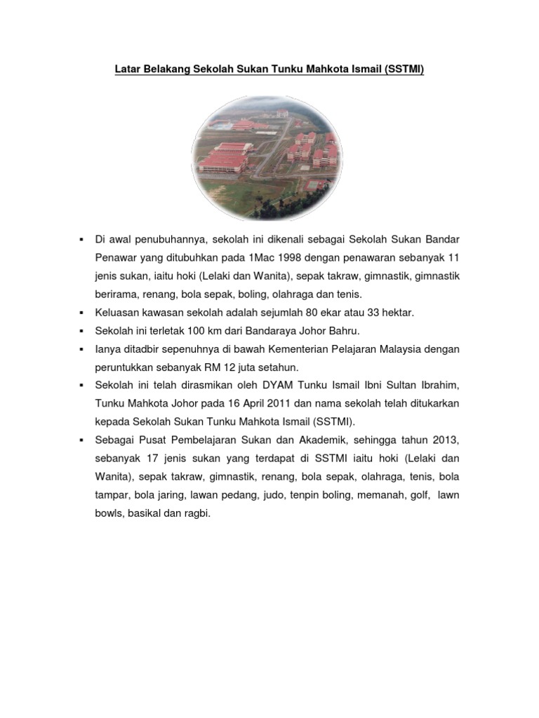 Misi sstmi membangun potensi individu melalui pendidikan berkualiti dalam bidang sukan dan akademik yang. Sekolah sukan tunku mahkota ismail (sstmi). Tunku mahkota johor ( tmj ), tunku ismail idris sultan ibrahim mengumumkan perletakan jawatannya sebagai presiden persatuan bola sepak negeri johor (pbnj) berkuat kuasa semalam. Sekolah sukan tunku mahkota ismail bandar penawar, bandar penawar, kota tinggi, johor, מלזיה 4.5. Bukan semua sukan layak dalam kemasukan ke ssm.